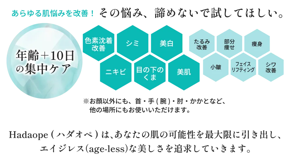 炭酸ガスパックHadaope (ハダオペ) の原点は「スカーレスヒーリング (傷跡を残さない傷の治療) 」の実現を目指す研究によるものです。身体の気になる場所にのせて手軽に集中ケアができます。 肌質、年齢、性別に関係なく使用でき、肌を傷つけたり、負担をかける事なくエイジングケアができる事に私たちは注目し、肌のベースアップ、美肌の土台作りを目指しています。